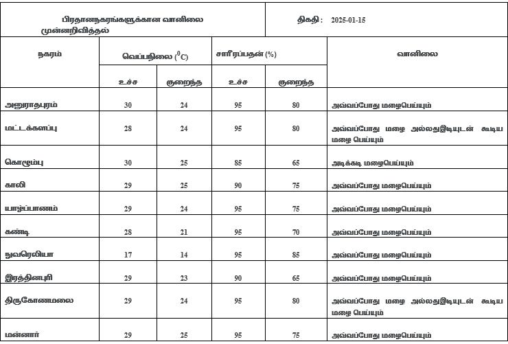 2025 ஜனவரி15 ஆம்திகதிக்கான பொதுவான வானிலை முன்னறிவிப்பு 2025 ஜனவரி 14 ஆம் திகதி நண்பகல் 12.00 மணிக்கு வெளியிடப்பட்டது.