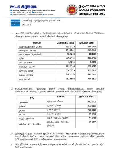 அதன்படி, ஏனைய வெளிநாட்டு நாணய மாற்று விகிதங்கள் தொடர்பாக இலங்கை மத்திய வங்கியினால் வெளியிடப்பட்டுள்ள தகவல்கள் கீழே தரப்பட்டுள்ளது.
