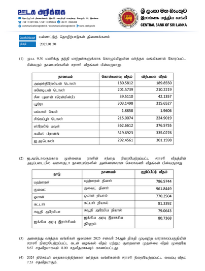 அதன்படி, ஏனைய வெளிநாட்டு நாணய மாற்று விகிதங்கள் தொடர்பாக இலங்கை மத்திய வங்கியினால் வெளியிடப்பட்டுள்ள தகவல்கள் கீழே தரப்பட்டுள்ளது.