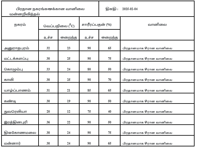 2025 பெப்ரவரி 04 ஆம் திகதிக்கான வானிலை முன்னறிவிப்பு 2025 பெப்ரவரி 04ஆம் திகதி அதிகாலை 05.30 மணிக்கு வெளியிடப்பட்டது.