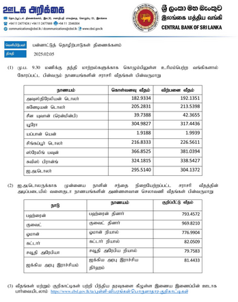 இலங்கை மத்திய வங்கி (05.02.2025) வெளியிட்டுள்ள நாணய மாற்று விகிதத்தின் அடிப்படையில் அமெரிக்க டொலரின் விற்பனை விலை 304.1372 ரூபாவாகவும் கொள்வனவு விலை 295.5140 ரூபாவாகவும் பதிவாகியுள்ளது.