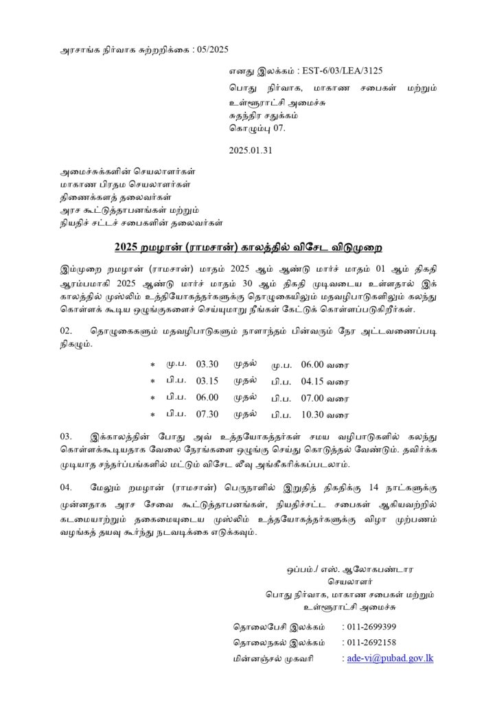 ரமழான் மாதம், 2025 ஆம் ஆண்டு மார்ச் 01 ஆம் திகதி ஆரம்பமாகி 2025 ஆண்டு மார்ச் 30 ஆம் திகதி முடிவடைய உள்ளதால் இந்த காலத்தில் முஸ்லிம் உத்தியோகத்தர்களுக்கு தொழுகையிலும் மதவழிபாடுகளிலும் கலந்து கொள்ளக் கூடிய ஒழுங்குகளைச் செய்யுமாறு அந்த அறிக்கையில் கோரப்பட்டுள்ளது.