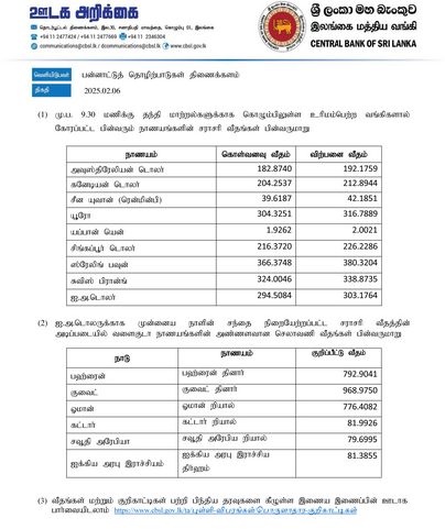 அதன்படி, ஏனைய வெளிநாட்டு நாணய மாற்று விகிதங்கள் தொடர்பாக இன்று (06.02.2025) மத்திய வங்கியினால் வெளியிடப்பட்டுள்ள தகவல்கள் கீழே தரப்பட்டுள்ளது.