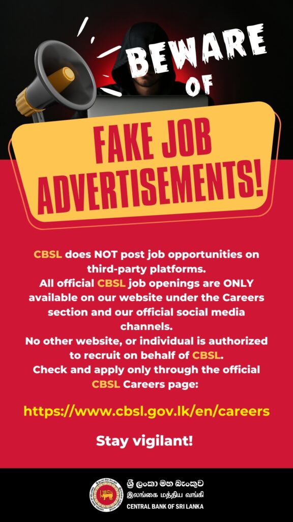 அதன்படி, அனைத்து வேலை வாய்ப்புகள் பற்றிய தகவல்களும் மத்திய வங்கியின் இணையத்தளத்தில் “வேலைகள்” என்பதன் கீழ் மற்றும் இலங்கை மத்திய வங்கியின் அதிகாரப்பூர்வ சமூக ஊடக வலைத்தளங்களில் மாத்திரமே வெளியிடப்படும் என்று இலங்கை மத்திய வங்கி வெளியிட்டுள்ள அறிக்கையில் மேலும் தெரிவிக்கப்பட்டுள்ளது.