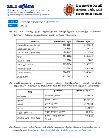 இலங்கை மத்திய வங்கியினால் வெளியிடப்பட்டுள்ள இன்றைய நாணய மாற்று விகிதங்கள் வருமாறு,