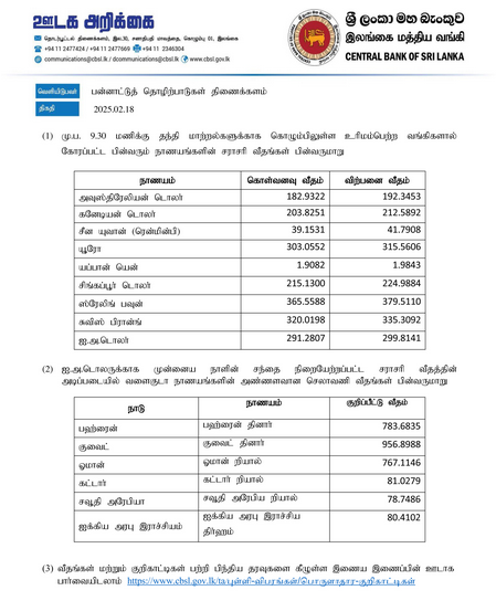 அதன்படி, ஏனைய வெளிநாட்டு நாணய மாற்று விகிதங்கள் தொடர்பாக இலங்கை மத்திய வங்கியினால் வெளியிடப்பட்டுள்ள தகவல்கள் கீழே தரப்பட்டுள்ளது.