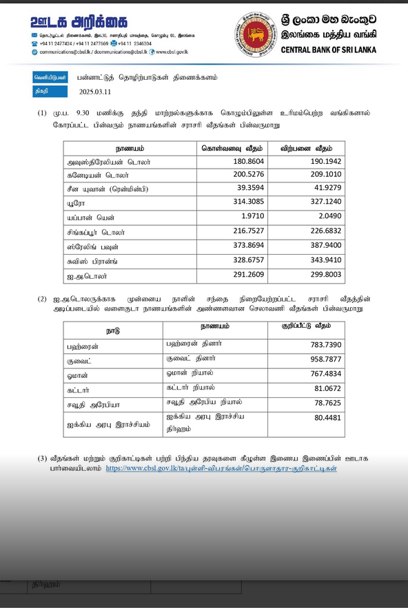 அதன்படி, ஏனைய வெளிநாட்டு நாணய மாற்று விகிதங்கள் தொடர்பாக மத்திய வங்கியினால் வெளியிடப்பட்டுள்ள தகவல்கள் கீழே தரப்பட்டுள்ளது.