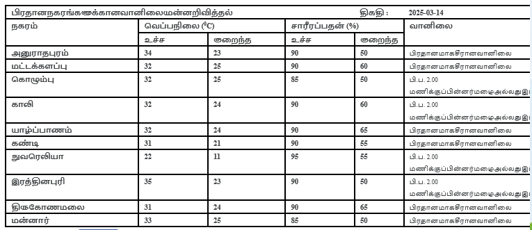 2025 மார்ச் 14ஆம்திகதிக்கான பொதுவான வானிலை முன்னறிவிப்பு 2025 மார்ச் 13ஆம் திகதி பிற்பகல் 02.00 மணிக்கு வெளியிடப்பட்டது.