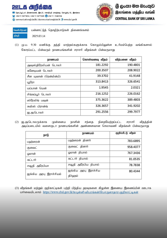 இலங்கை மத்திய வங்கி இன்று (14.03.2025) வெளியிட்டுள்ள நாணயமாற்று விகிதத்தின் அடிப்படையில் அமெரிக்க டொலரின் விற்பனை விலை ரூபா 299.7977 ஆகவும் கொள்வனவு விலை ரூபா 291.2556 ஆகவும் பதிவாகியுள்ளமை குறிப்பிடத்தக்கது.
