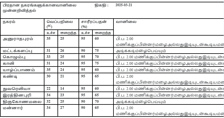 2025 மார்ச் 21 ஆம் திகதிக்கான வானிலை முன்னறிவிப்பு 2025 மார்ச் 21 ஆம் திகதி அதிகாலை 05.30 மணிக்கு வெளியிடப்பட்டது.
