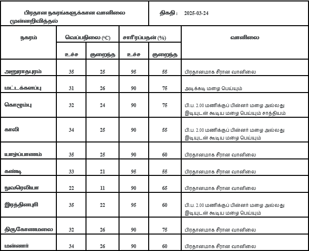 2025 மார்ச்24 ஆம் திகதிக்கான வானிலை முன்னறிவிப்பு 2025 மார்ச் 24 ஆம் திகதி அதிகாலை 05.30 மணிக்கு வெளியிடப்பட்டது.