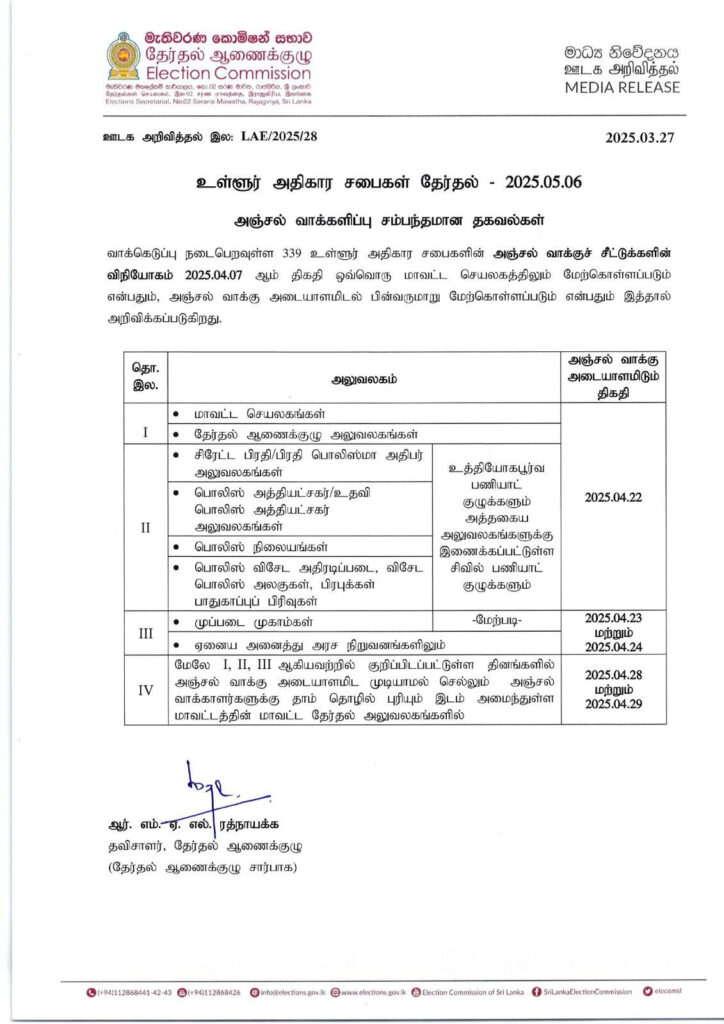 தேர்தல்கள் ஆணைக்குழுவின் தலைவர் ஆர்.எம்.ஏ.எல் ரத்னாயக்க கொழும்பில் இன்று (27.03.2025) இடம்பெற்ற செய்தியாளர் சந்திப்பில் வைத்து இந்த அறிவிப்பை வெளியிட்டுள்ளார்.