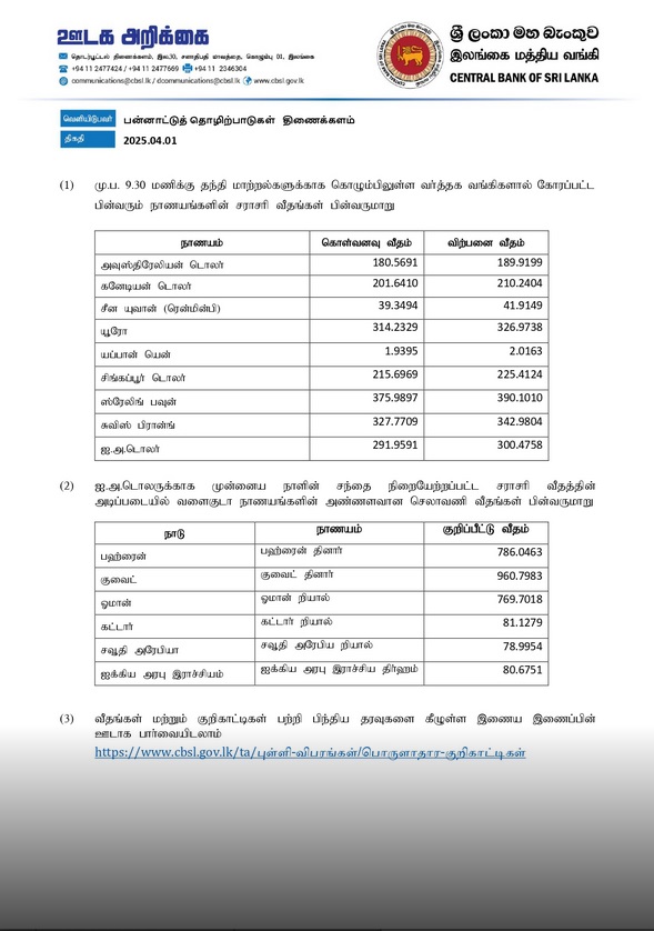 இலங்கை மத்திய வங்கி இன்று (01.04.2025) வெளியிட்டுள்ள நாணயமாற்று விகிதத்தின் அடிப்படையில்,