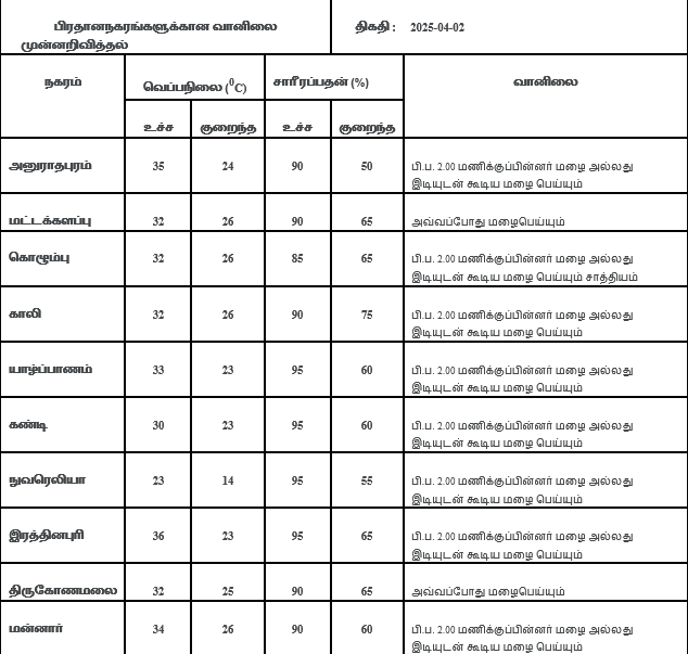 2025 ஏப்ரல் 02 ஆம் திகதிக்கான வானிலை முன்னறிவிப்பு 2025 ஏப்ரல் 02 ஆம் திகதி அதிகாலை 05.30 மணிக்கு வெளியிடப்பட்டது.