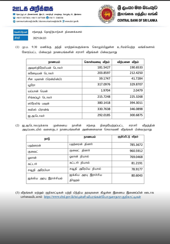 அதன்படி, ஏனைய வெளிநாட்டு நாணய மாற்று விகிதங்கள் தொடர்பாக இலங்கை மத்திய வங்கியினால் வெளியிடப்பட்டுள்ள தகவல்கள் கீழே தரப்பட்டுள்ளது.