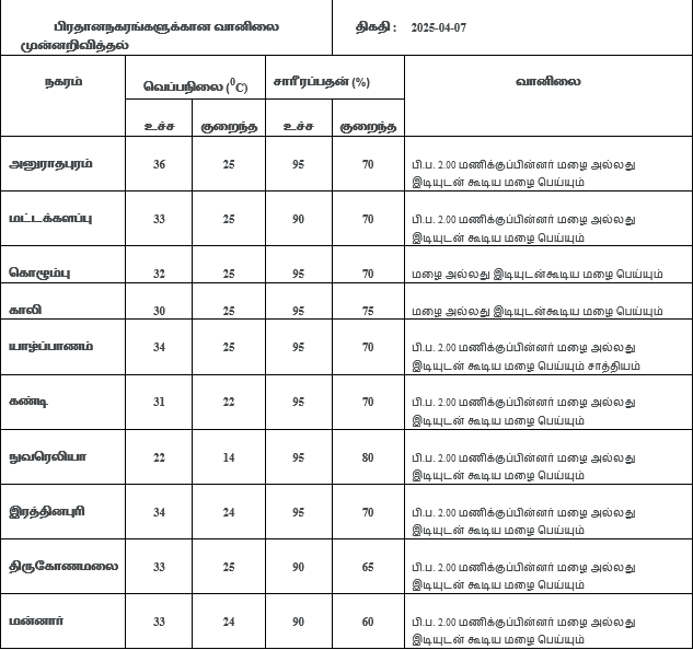 2025 ஏப்ரல் 07ஆம் திகதிக்கான பொதுவான வானிலை முன்னறிவிப்பு 2025 ஏப்ரல் 06 ஆம் திகதி பிற்பகல் 02.00 மணிக்கு வெளியிடப்பட்டது.