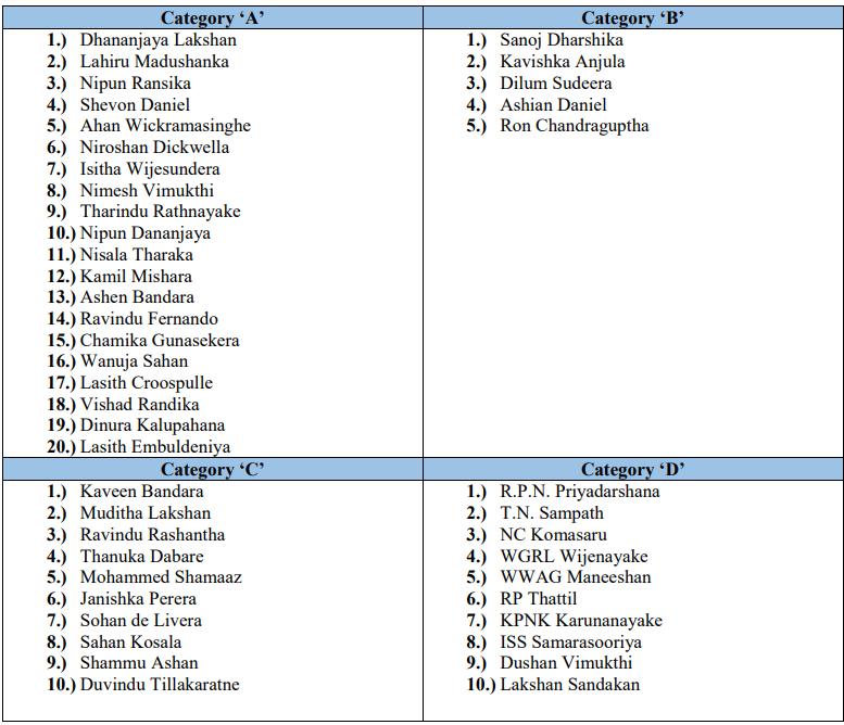 இலங்கை கிரிக்கெட் தேர்வுக் குழுவினால் மேற்கொள்ளப்பட்ட தேர்வுகளின் அடிப்படையில், ஒப்பந்தம் பெற்ற வீரர்கள் A, B, C மற்றும் D என நான்கு பிரிவுகளாக வகைப்படுத்தப்பட்டுள்ளனர்.