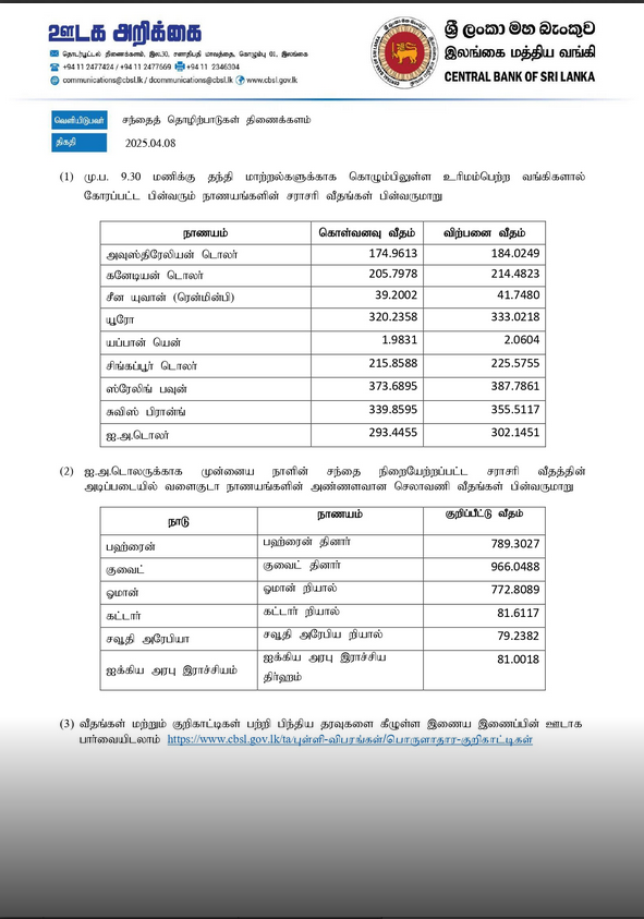 அதன்படி, ஏனைய வெளிநாட்டு நாணய மாற்று விகிதங்கள் தொடர்பாக இன்று இலங்கை மத்திய வங்கியினால் வெளியிடப்பட்டுள்ள தகவல்கள் கீழே தரப்பட்டுள்ளது.