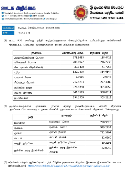 அதன்படி, ஏனைய வெளிநாட்டு நாணய மாற்று விகிதங்கள் தொடர்பாக இன்று (10.4.2025) மத்திய வங்கியினால் வெளியிடப்பட்டுள்ள தகவல்கள் கீழே தரப்பட்டுள்ளது.