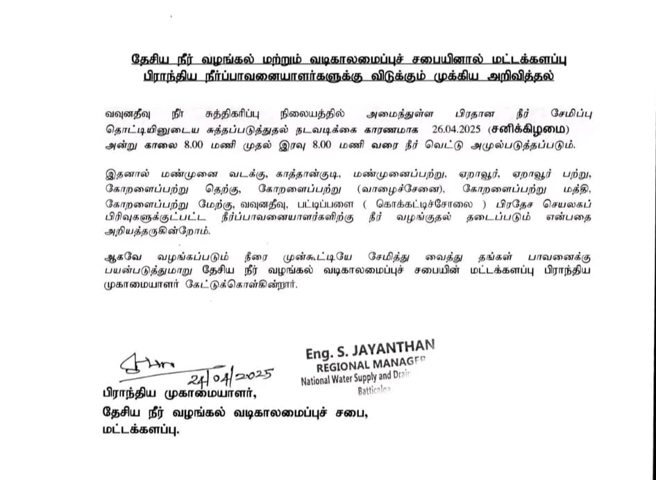 பொதுமக்கள் இந்த நீர் வெட்டுக்கு முன்னேற்பாடு செய்து, தேவையான அளவு நீரை சேமித்து வைக்குமாறு, மட்டக்களப்பு பிராந்திய முகாமையாளர் பொறியியலாளர் S. ஜெயந்தன் கேட்டுக்கொண்டுள்ளார்.