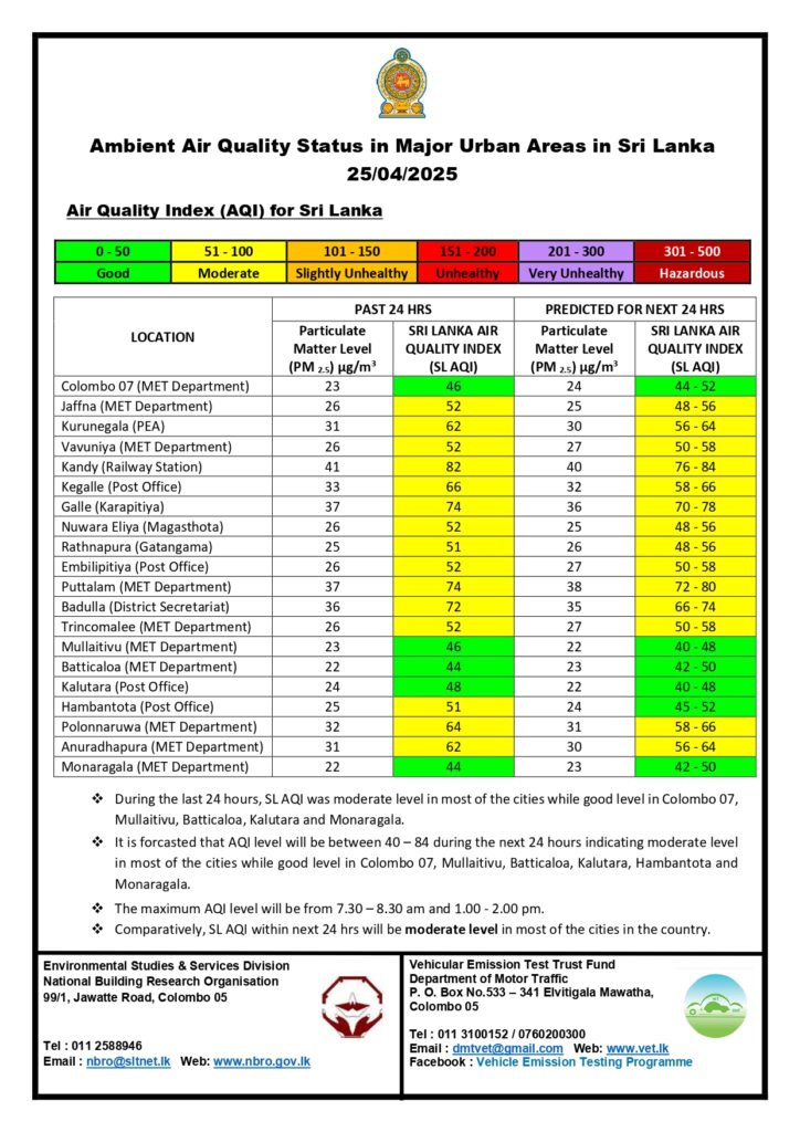 கடந்த 24 மணி நேரத்தில், பெரும்பாலான பகுதிகளில் இலங்கை காற்றின் தரச் சுட்டெண் மிதமான அளவிலும், கொழும்பு 07, முல்லைத்தீவு, மட்டக்களப்பு, களுத்துறை மற்றும் மொனராகலை ஆகிய பகுதிகளில் ஆரோக்கியமான நிலையிலும் காணப்பட்டது.