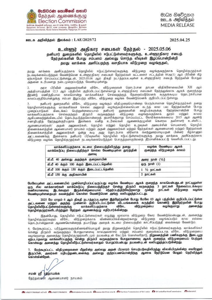 தமது வாக்கை அளிப்பதற்காக தொழிலில் ஈடுபட்டுள்ளவர்களுக்கு விடுமுறை வழங்குவதற்காக தொழில்தருநர்கள் நடவடிக்கையெடுத்தல் வேண்டுமென உள்ளூராட்சி சபைகள் தேர்தல்கள் கட்டளைச் சட்டத்தின் 84அ(1) ஆம் பிரிவின் கீழ் ஏற்பாடுகள் செய்யப்பட்டுள்ளதுடன், 2025.05.06 ஆம் திகதி நடாத்தப்படவுள்ள உள்ளூராட்சி சபைத் தேர்தலின் போதும் அதனை உரியவாறு நடைமுறைப்படுத்த வேண்டியுள்ளது.