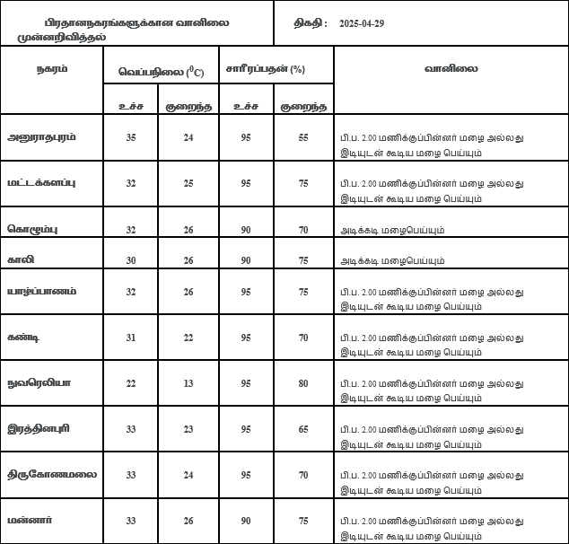 2025 ஏப்ரல் 29 ஆம் திகதிக்கான வானிலை முன்னறிவிப்பு 2025 ஏப்ரல் 29 ஆம் திகதி அதிகாலை 05.30 மணிக்கு வெளியிடப்பட்டது.