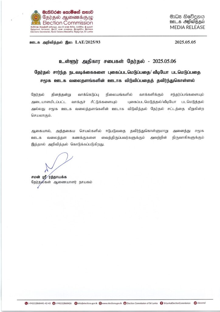 குறித்த அறிக்கையின் பிரகாரம், தேர்தல் தொடர்பான நடவடிக்கைகளின் போது புகைப்படம் மற்றும் வீடியோக்களை எடுப்பதைத் தவிர்க்குமாறு பொதுமக்கள் வலியுறுத்தப்பட்டுள்ளனர்.