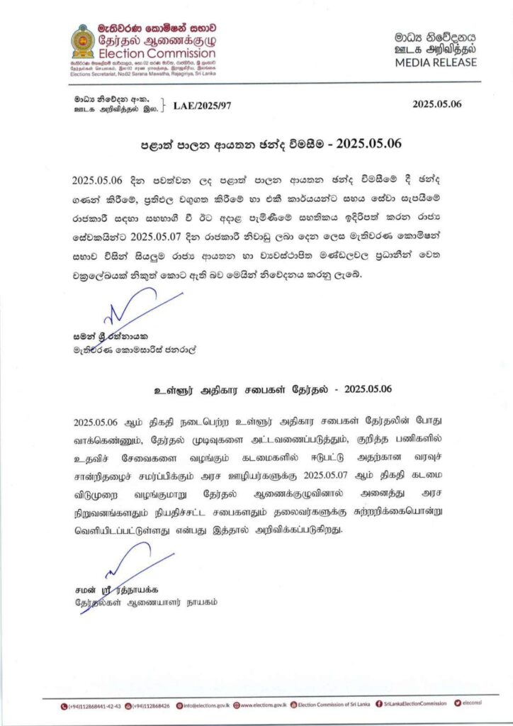 அதன்படி, 06.05.2025 ஆம் திகதி நடைபெற்ற உள்ளூராட்சி மன்றத் தேர்தலின் போது வாக்கெண்ணும், தேர்தல் முடிவுகளை அட்டவணைப்படுத்தும், குறித்த பணிகளில் உதவிச் சேவைகளை வழங்கும் கடமைகளில் ஈடுபட்டு அதற்கான வரவுச் சான்றிதழைச் சமர்ப்பிக்கும் அனைத்து அரச ஊழியர்களுக்கும் இன்று விடுமுறை வழங்குமாறு அறிவிக்கப்பட்டுள்ளது.