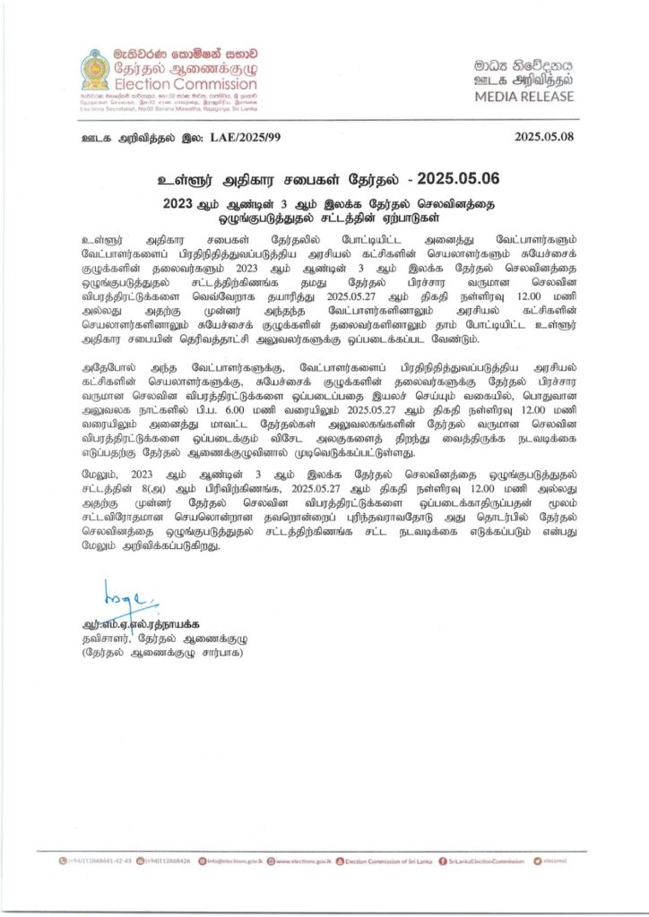 அதன் அடிப்படையில், 2023 ஆம் ஆண்டின் 03 ஆம் எண் தேர்தல் செலவின ஒழுங்குமுறைச் சட்டத்தின்படி, வேட்பாளர்கள், தேர்தல் பிரச்சார வருமானம் மற்றும் செலவினங்கள் குறித்து தனித்தனி அறிக்கைகளைத் தயாரித்து சமர்ப்பிக்க வேண்டும் என்றும் தேர்தல் ஆணைக்குழு குறிப்பிட்டுள்ளது.