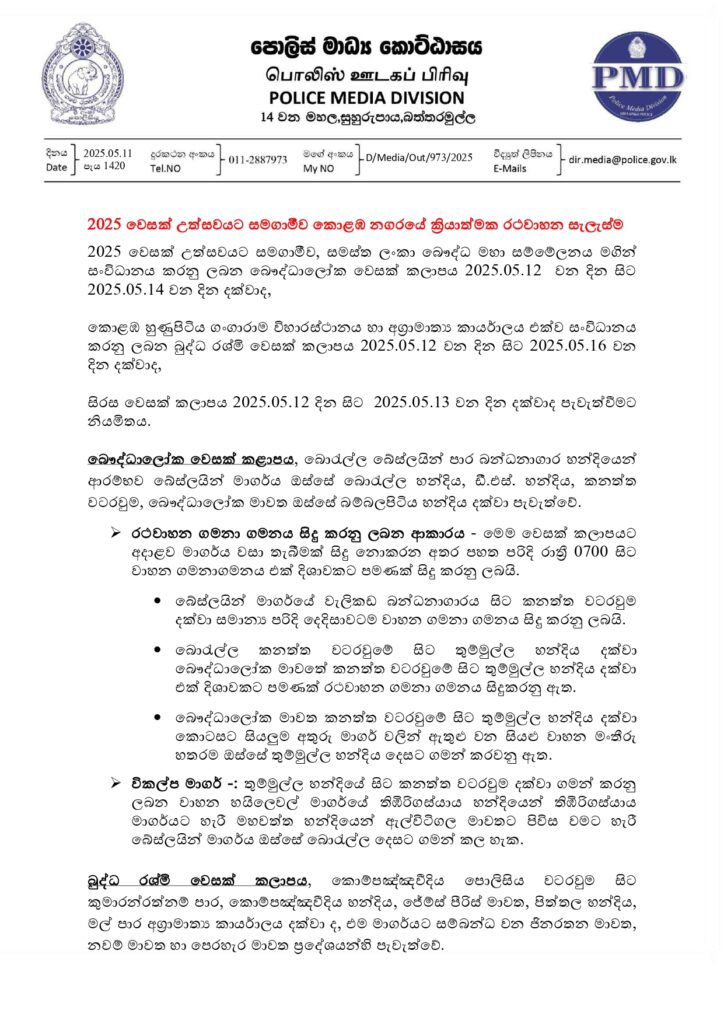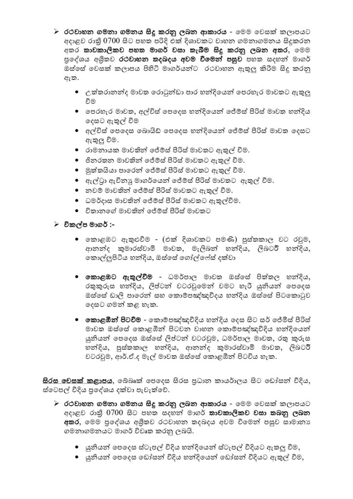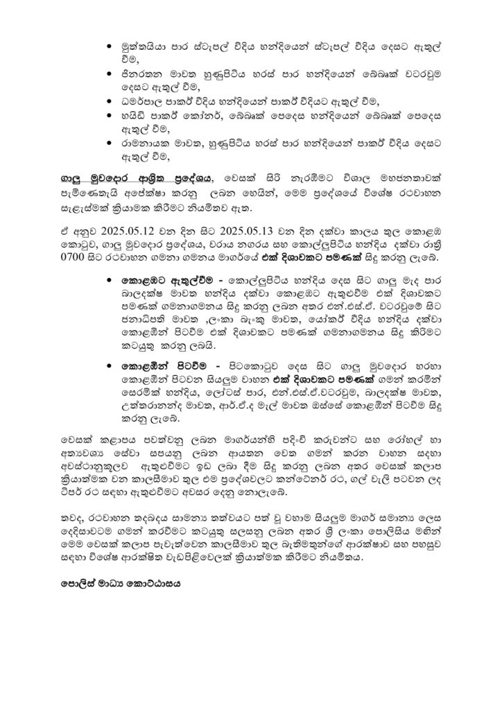 12.05.2025 முதல் 13.05.2025 வரை, காலை 7.00 மணி முதல் கொழும்பு கோட்டை, காலி முகத்திடல் பகுதி, துறைமுக நகரம் மற்றும் கொள்ளுப்பிட்டி சந்திக்கு இடையில் ஒரு வழிப் போக்குவரத்து மட்டுமே இடம்பெறவுள்ளது.