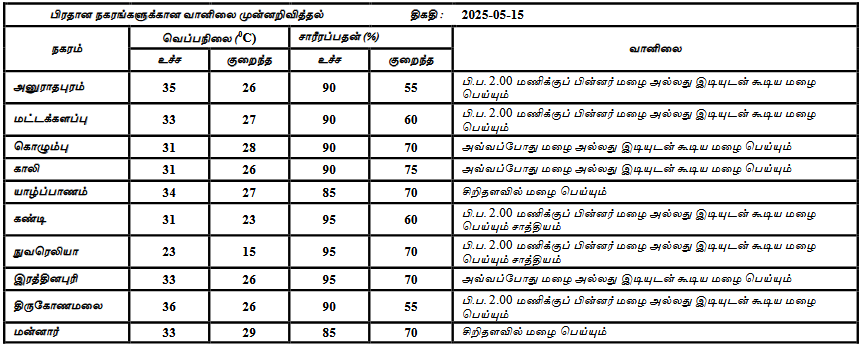 2025 மே 15 ஆம் திகதிக்கான வானிலை முன்னறிவிப்பு 2025 மே 15 ஆம் திகதி காலை 05.30 மணிக்கு வெளியிடப்பட்டது.