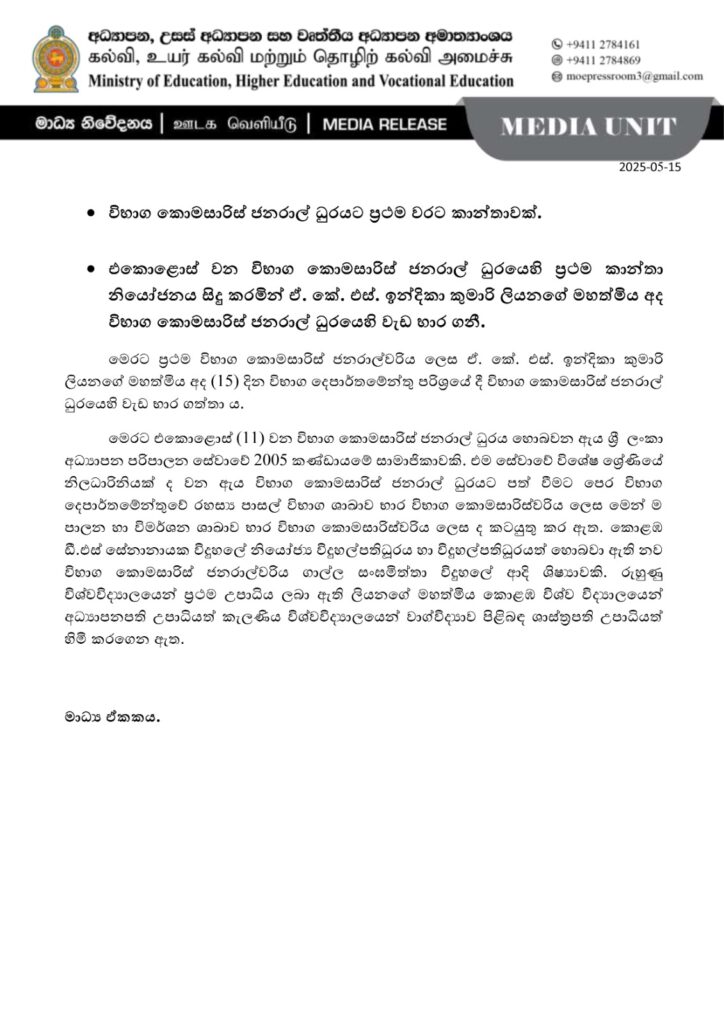 இலங்கை வரலாற்றில் முதல் முறையாக,நியமிக்கப்பட்ட பெண் பரீட்சைகள் ஆணையாளர் நாயகமான ஏ.கே.எஸ். இந்திகா குமாரி லியனகே 15.05.2025 அன்று நாட்டின் 11வது பரீட்சைகள் ஆணையாளர் நாயகமாக அதிகாரபூர்வமாக கடமைகளைப் பொறுப்பேற்றார்.