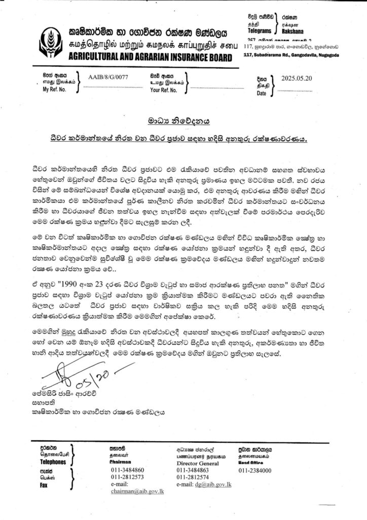 புதிய அரசாங்கம் இந்த விடயத்தில் விசேட கவனம் செலுத்தி, இந்த விபத்துகளுக்கு இழப்பீடு வழங்குவதன் மூலம் மீனவர்கள் நீண்டகாலமாக தொழிலில் ஈடுபடுவதை உறுதி செய்வதற்காக இந்த காப்பீட்டுத் திட்டத்தை அறிமுகப்படுத்தியுள்ளதாக விவசாய மற்றும் விவசாய காப்பீட்டு சபை தெரிவித்துள்ளது.