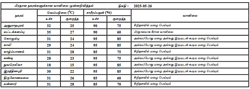 26 மே 2025 ஆம் திகதிக்கான வானிலை முன்னறிவிப்பு 26 மே 2025 அன்று காலை 05.30 மணிக்கு வெளியிடப்பட்டது