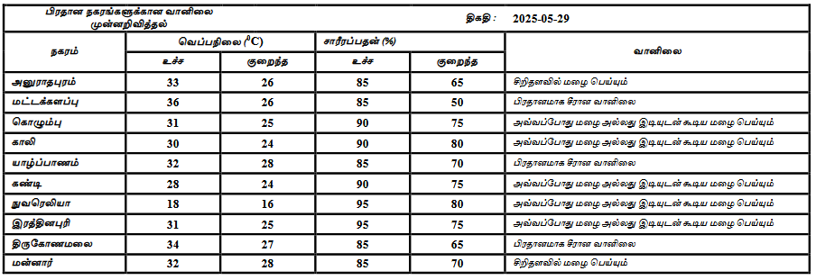 2025 மே 29 ஆம் திகதிக்கான வானிலை முன்னறிவிப்பு 2025 மே 29 ஆம் திகதி அதிகாலை 05.30 மணிக்கு வெளியிடப்பட்டது.