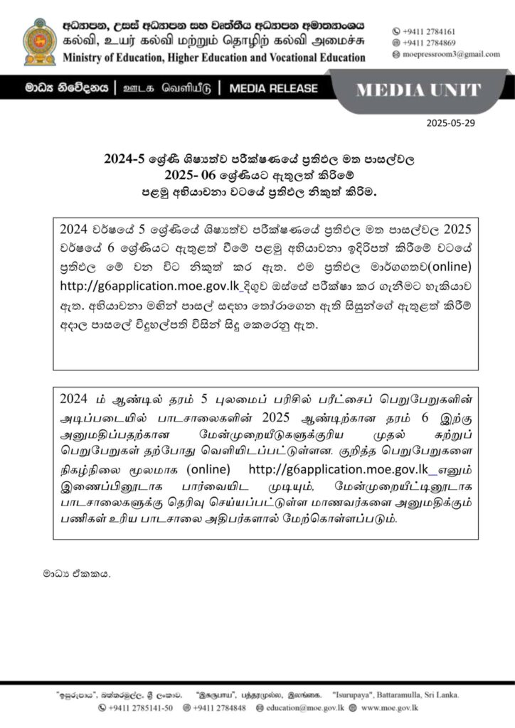 2024 ஆம் ஆண்டு தரம் 5 புலமைப்பரிசில் பரீட்சைப் பெறுபேறுகளின் அடிப்படையில், 2025 ஆம் ஆண்டு 6 ஆம் தரத்திற்கு மாணவர்களை உள்வாங்குவதற்கான முதல் சுற்று மேன்முறையீட்டு பெறுபேறுகள் தற்போது வெளியிடப்பட்டுள்ளதாக கல்வி அமைச்சு தெரிவித்துள்ளது.