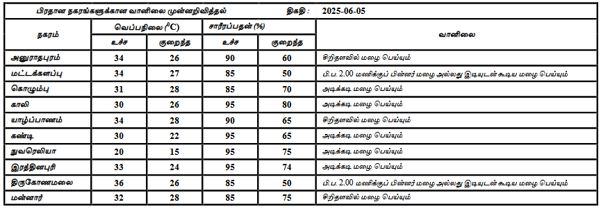 2025 ஜூன் 05 ஆம் திகதிக்கான வானிலை முன்னறிவிப்பு 2025 ஜூன் 05 ஆம் திகதி காலை 05.30 மணிக்கு வெளியிடப்பட்டது