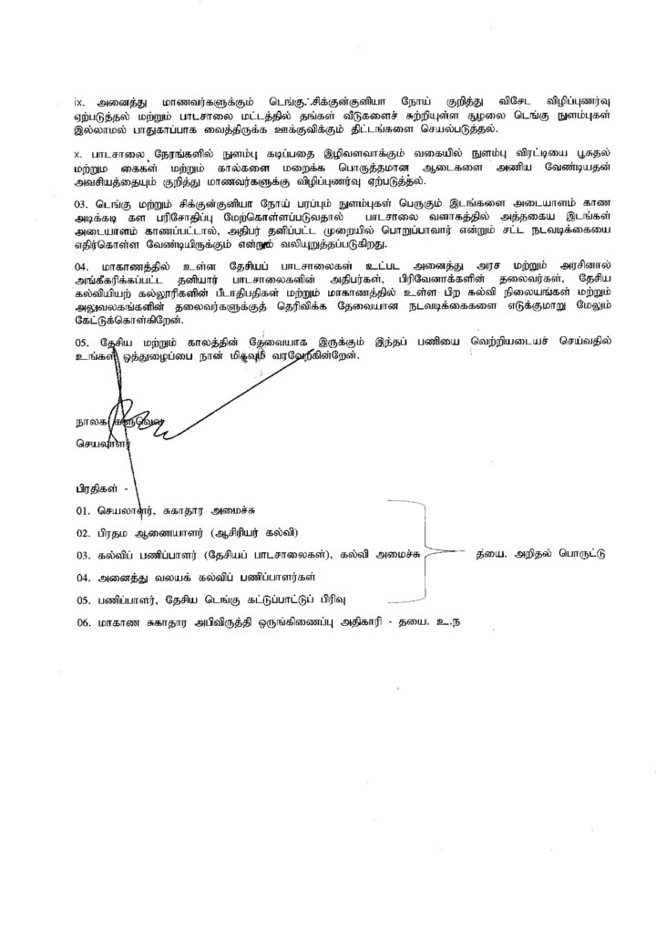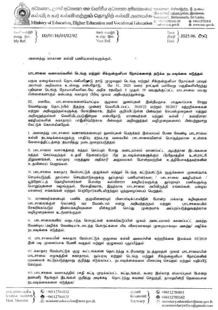 இதன் ஊடாக பாடசாலைச் சூழலை நுளம்புகள் இல்லாமல் பாதுகாப்பாக பேண் வேண்டியது தொடர்பில் முன்னர் வெளியிடப்பட்ட 2010/22 மற்றும் 30/2017 சுற்றறிக்கைகள் மற்றும் அறிவுறுத்தல்களுக்கு மேலதிகமாக, இதில் குறிப்பிட்டுள்ள பின்வரும் செயன்முறைகள் மற்றும் அறிவுறுத்தல்கள் வௌியிடப்பட்டுள்ளன என்பதோடு மாணவர்கள் மற்றும் கல்வி/கல்விசாரா ஊழியர்களின் சுகாதாரப் பாதுகாப்பிற்காக பின்வரும் அறிவுறுத்தல் வழிமுறைகளைப் பின்பற்றுமாறு கேட்டுக்கொள்வதாக கல்வியமைச்சு வெளியிட்டுள்ள அறிக்கையில் தெரிவிக்கப்பட்டுள்ளது.
