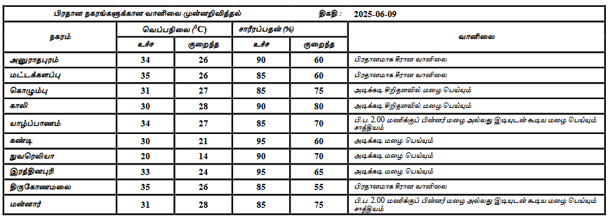 2025 ஜூன் 09 ஆம்திகதிக்கான வானிலை முன்னறிவிப்பு 2025 ஜூன் 08 ஆம் திகதி பிற்பகல் 2.00 மணிக்கு வெளியிடப்பட்டது