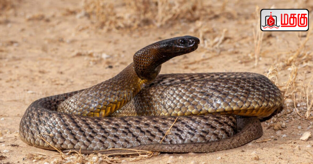 இந்த பாம்பின் விஷத்தில் டைபோக்சின் (taipoxin), மைக்கோடாக்சின்கள் (mycotoxins), நியூரோடாக்சின்கள் (neurotoxins), புரோகோ ஆகுலண்ட்ஸ் (procoagulants) ஆகியவை கொண்ட கலவை இருக்கிறதாம். இந்த விஷம் மனித உடலில் பாய்ந்தால் ரத்த நாளங்கள் மற்றும் தசை திசுக்களில் ரத்தக்கசிவை ஏற்படுத்தி, சுவாசத்தை தடுக்கச் செய்யுமாம்.