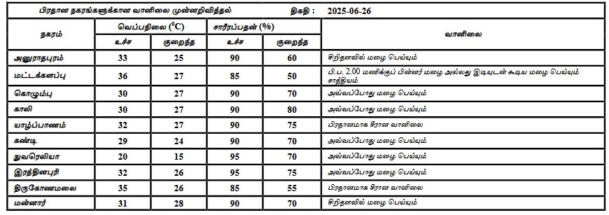26 ஜூன் 2025 ஆம் திகதிக்கான வானிலை முன்னறிவிப்பு 26 ஜூன் 2025 அன்று காலை 05.30 மணிக்கு வெளியிடப்பட்டது