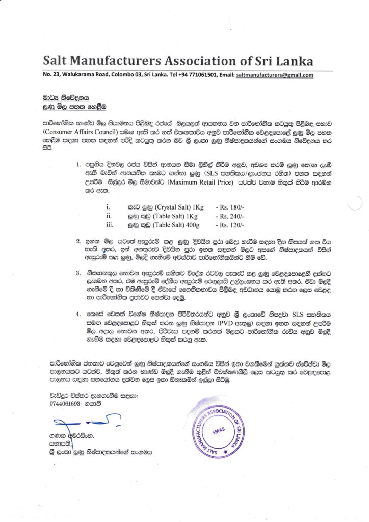 நுகர்வோர் விவகார அதிகார சபையுடன் எட்டப்பட்ட ஒப்பந்தத்தின் அடிப்படையில், சந்தையில் உப்பின் விலையை குறைத்து, அதிகபட்ச சில்லறை விலையில் உப்பை விற்பனை செய்ய தீர்மானித்துள்ளதாக இலங்கை உப்பு உற்பத்தியாளர்கள் சங்கம் தெரிவித்துள்ளது.
