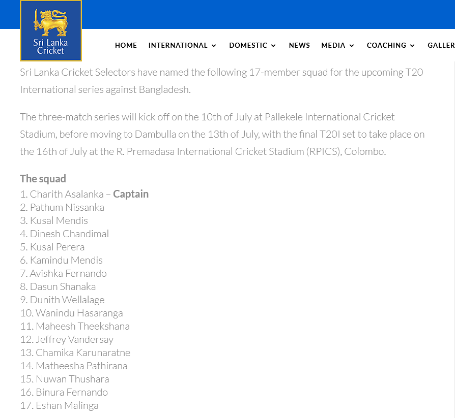 சுற்றுலா பங்களாதேஷ் அணிக்கு எதிராக 3 போட்டிகளை கொண்ட T20 தொடருக்கான இலங்கை அணி இன்று (07.07.2025) அறிவிக்கப்பட்டுள்ளது.
