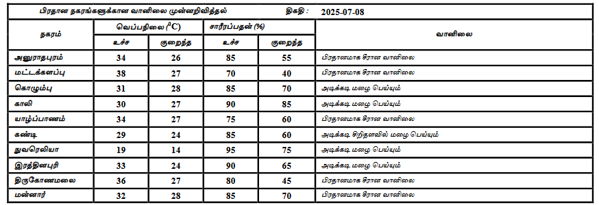 2025 ஜூலை 08 ஆம் திகதிக்கான வானிலை முன்னறிவிப்பு 2025 ஜூலை 08 ஆம் திகதி அதிகாலை 05.30 மணிக்கு வெளியிடப்பட்டது.