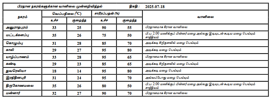 2025 ஜூலை 18 ஆம் திகதிக்கான வானிலை முன்னறிவிப்பு 2025 ஜூலை 18 ஆம் திகதி அதிகாலை 05.30 மணிக்கு வெளியிடப்பட்டது.