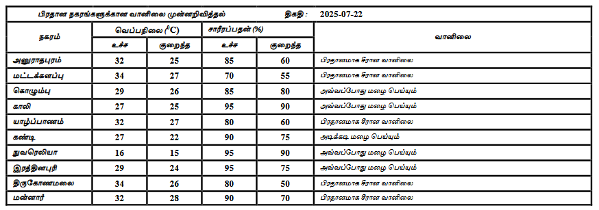 2025 ஜூலை 23 ஆம் திகதிக்கான வானிலை முன்னறிவிப்பு 2025 ஜூலை 23 ஆம் திகதி அதிகாலை 05.30 மணிக்கு வெளியிடப்பட்டது.