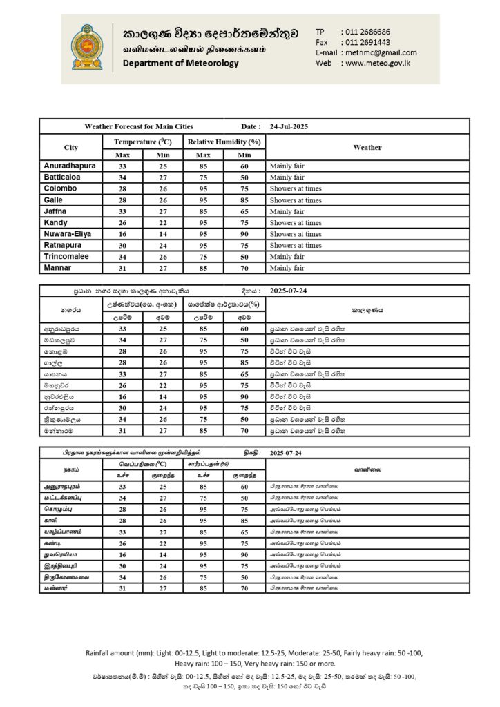 24 ஜூலை 2025 க்கான வானிலை முன்னறிவிப்பு 24 ஜூலை 2025 அன்று காலை 05.30 மணிக்கு வெளியிடப்பட்டது.