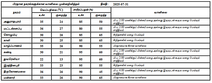 2025 ஜூலை 31 ஆம் திகதிக்கான வானிலை முன்னறிவிப்பு 2025 ஜூலை 31 ஆம் திகதி அதிகாலை 05.30 மணிக்கு வெளியிடப்பட்டது.