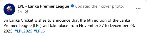 2025 ஆம் ஆண்டுக்கான லங்கா பிரீமியர் லீக் (LPL) இருபதுக்கு 20 கிரிக்கெட் தொடர் நவம்பர் மாதம் 27 ஆம் திகதி முதல் டிசம்பர் மாதம் 23 ஆம் திகதி வரை நடைபெறும் என்று ஸ்ரீலங்கா கிரிக்கெட் இன்று (01.08.2025) அறிவித்துள்ளது.